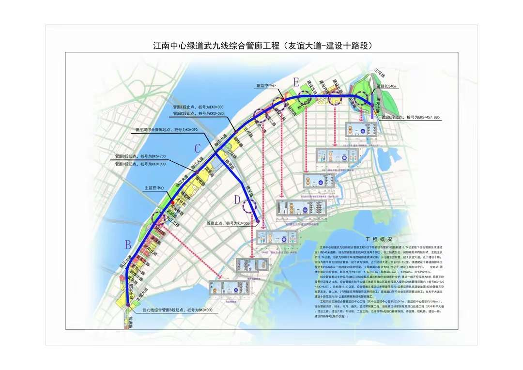 作為省市兩級重點工程,武九綜合管廊全長約16.2公里,是武漢市城市地下綜合管廊專項規(guī)劃確定的重要干線管廊,創(chuàng)下多個“國內(nèi)之最”。它是國內(nèi)城市核心即老城區(qū)單次建設規(guī)模最大(長度、斷面)的綜合管廊,是服務城市核心功能區(qū)(武昌濱江商務區(qū)、青山濱江商務區(qū)、華中金融城)數(shù)量最多的綜合管廊。