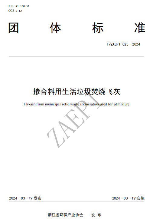 《摻合料用生活垃圾焚燒飛灰》標(biāo)準(zhǔn)號T/ZAEPI 025-2024,該標(biāo)準(zhǔn)由浙江京蘭環(huán)??萍加邢薰竞驼憬髮W(xué)主編,由浙江省環(huán)保產(chǎn)業(yè)協(xié)會于2024年3月19日批準(zhǔn)發(fā)布,2024年3月19日起實(shí)施。文件規(guī)定了摻合料用生活垃圾焚燒飛灰的術(shù)語和定義、技術(shù)要求、試驗(yàn)方法、檢驗(yàn)規(guī)則、包裝、標(biāo)志、運(yùn)輸和貯存。文件適用于低溫?zé)岱纸饧八唇舛竟に囂幚砗蠓?HJ 1134規(guī)定的摻合料用生活垃圾焚燒飛灰,為后續(xù)飛灰處理產(chǎn)物的產(chǎn)品化進(jìn)一步拓寬了應(yīng)用場景。