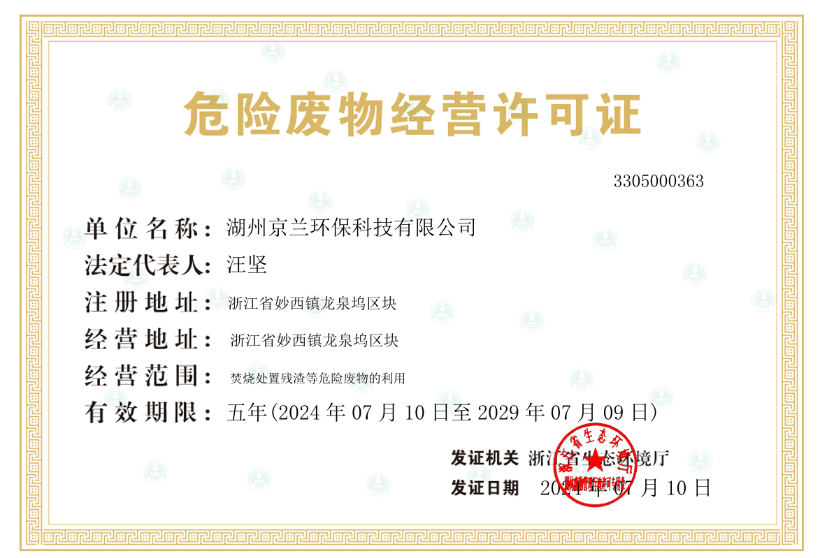 近日,湖州京蘭環(huán)??萍加邢薰荆ㄏ路Q湖州京蘭)順利完成危險廢物經(jīng)營許可證換證工作,取得由浙江省生態(tài)環(huán)境廳頒發(fā)的危險廢物經(jīng)營許可證,有效期為5年。