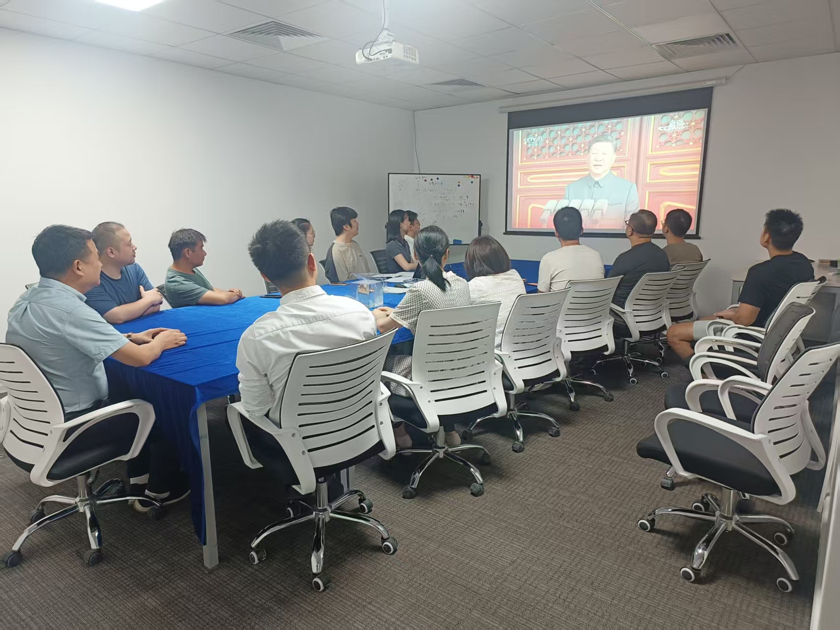 上午9時,大家準時聚集在各公司的會議室,自發(fā)整理好衣襟,眼神中滿是期待與肅穆。當直播畫面切到天安門廣場,鮮艷的五星紅旗在晨光中冉冉升起,激昂的歌聲里,是跨越代際的信仰傳承,是屬于京蘭人的集體共鳴。?